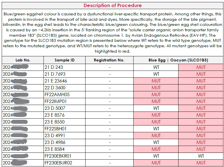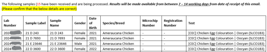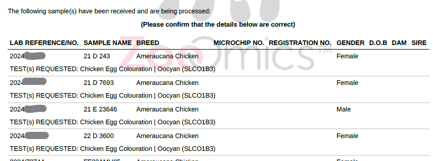 For local DNA testing in South Africa, we have approached a lab in Pretoria called ZooOmics™. They were already conducting DNA testing on other animals but not yet on chickens. Upon request, their R&D team, real superstars, took only a week to develop the first test on chickens for us, which was for the Blue Egg gene, Oocyan (SLCO1B3). We are now exclusively DNA testing our chickens with ZooOmics™ and are working with them to develop more tests for us.