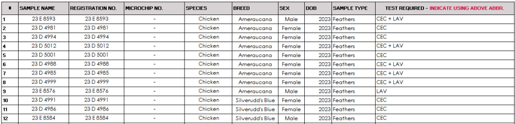 Complete the Form: When completing the form, you may leave the registration number and microchip number blank. For species, add “Chicken” and then add your breed. Ensure to add the correct gender and date of birth. The sample type will be feather or blood, depending on your selection. In the Sample Name (or Sample ID) column, add your ring number if the chicken is ringed with a SASPO ring. If the chicken is not ringed, create a unique code that you can use to reference that particular chicken.