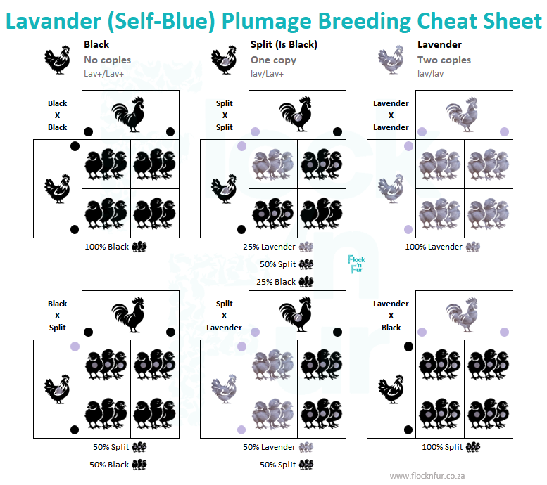Once you have your results, you can use the Lavender Plumage Breeding Cheat Sheet below to understand what to expect from matches based on your chicken’s Lavender gene test results. For more information on breeding for Lavender Plumage, see our article, on the subject.
