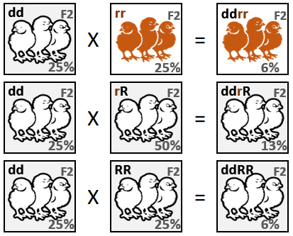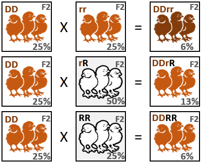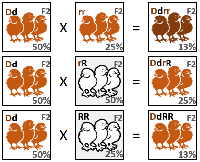 From the above calculations, only 19% (6% + 13%) of offspring will lay the darkest brown eggs, and 19% will lay white or tan. The rest will lay eggs with varying shades of brown in between.