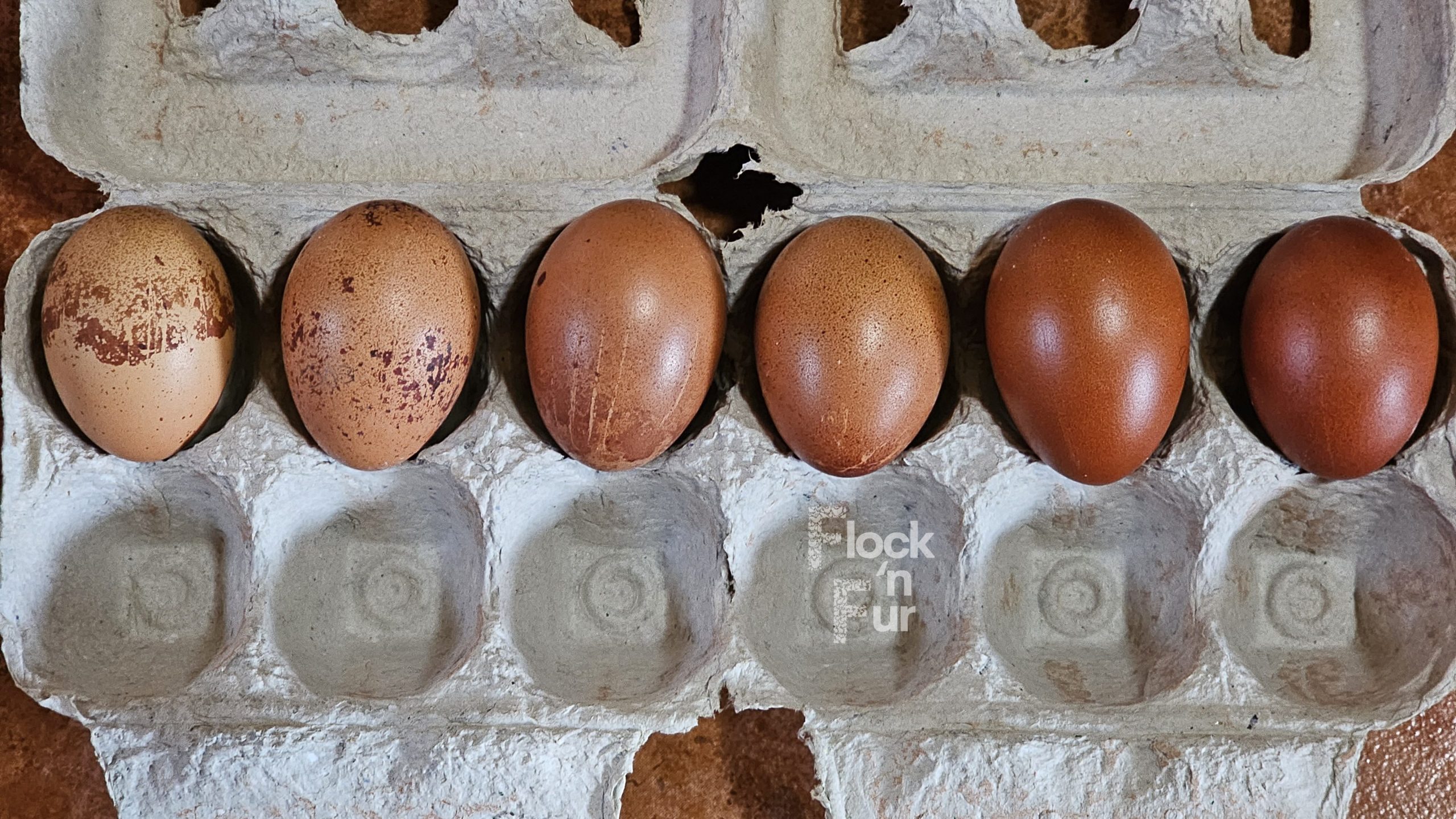 As an example of inconsistent egg colour from the same hen, these are the first six eggs that a single pullet laid over a three-week period – oldest (first egg she ever laid) on the left and newest egg on the right.