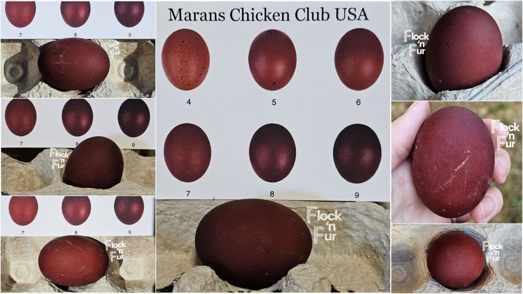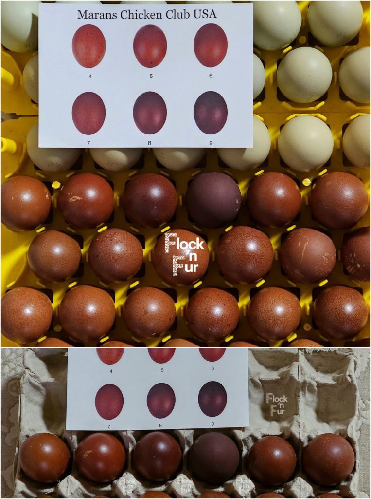 Same as with green and blue eggs, lighting also plays a significant role in Marans eggs. The colour change in different lighting is even reflected on the colour chart provided by the Marans Chicken Club US, as shown in some of the photos at the bottom of the page. It is also important to note that a freshly laid egg is typically more red, and in a week or two, it will turn slightly more brown, thus also contributing to the colour shifts of the actual eggshell.